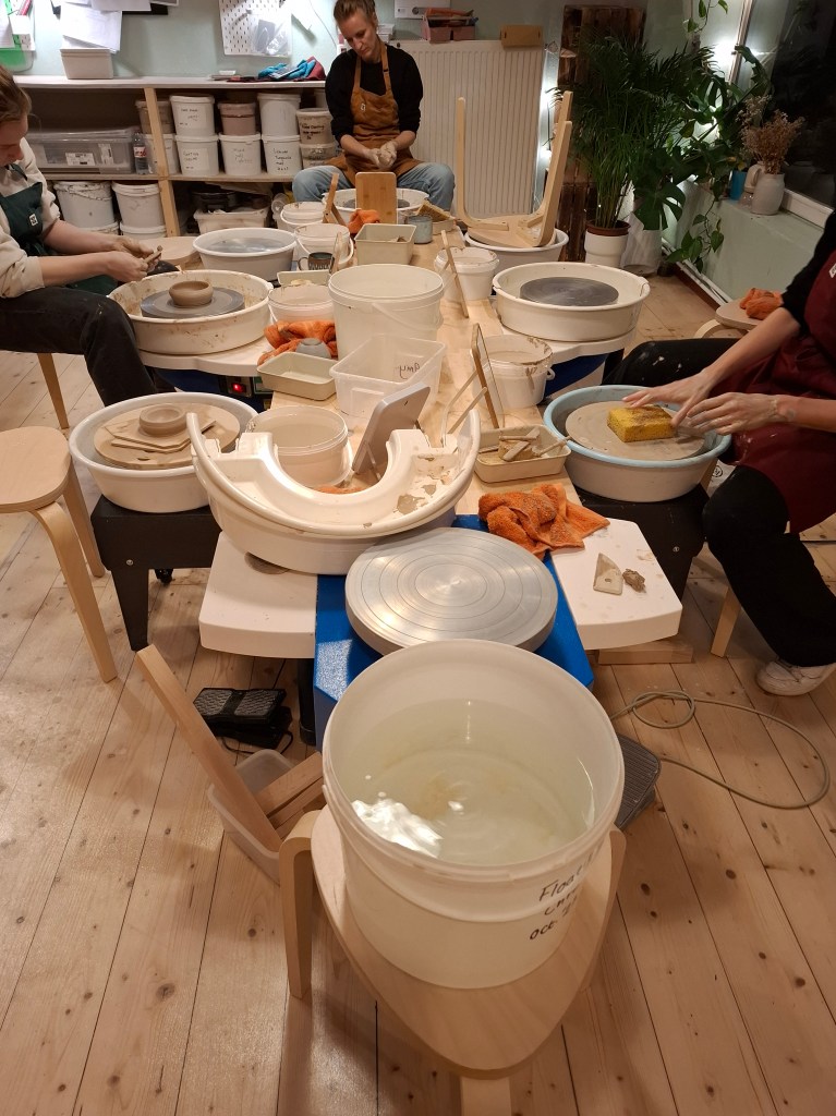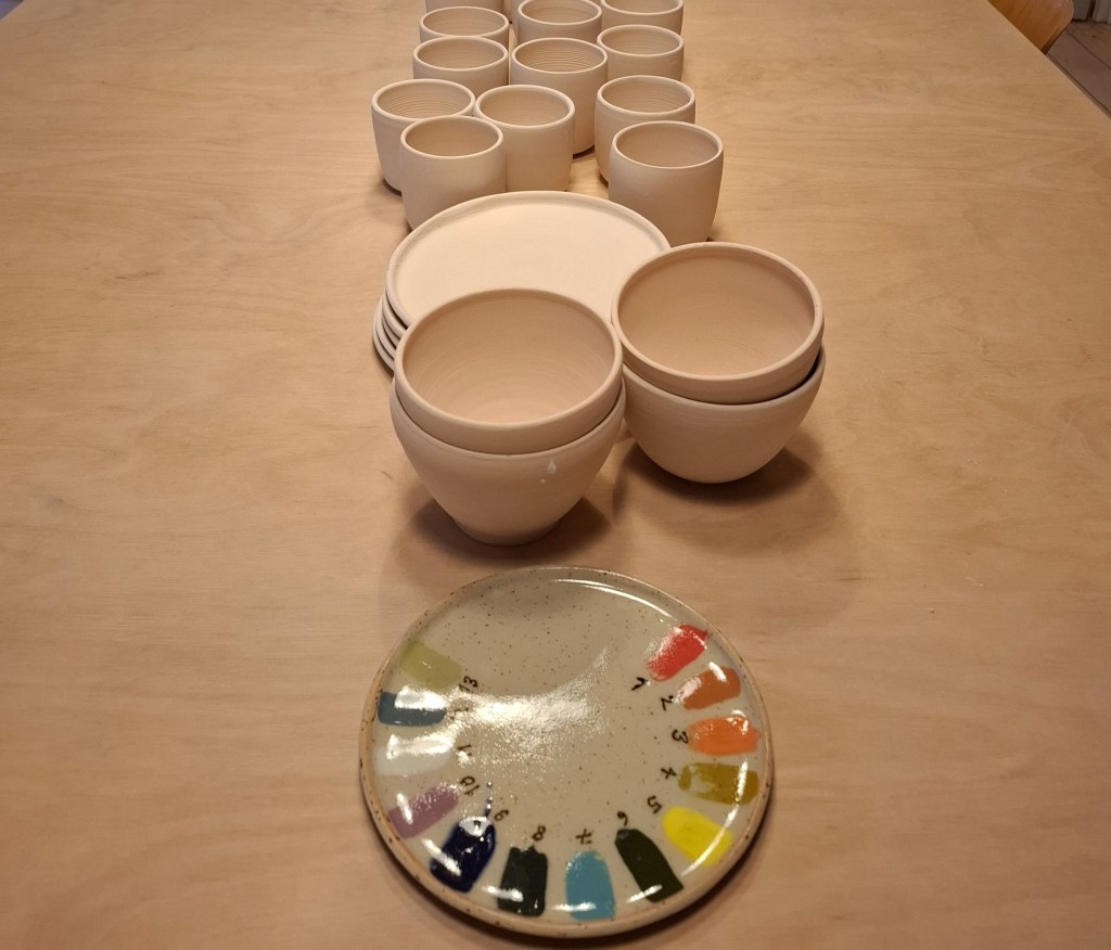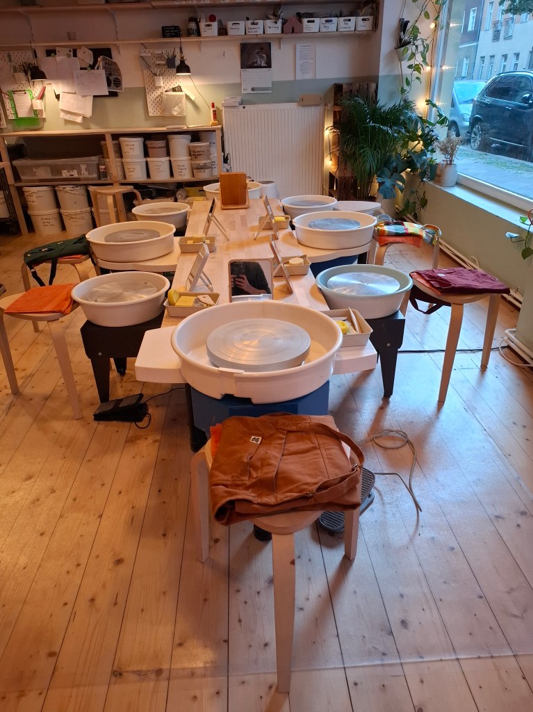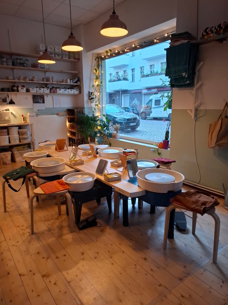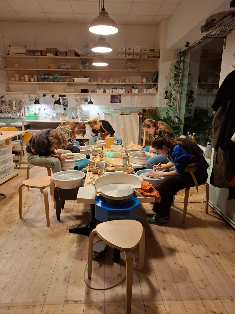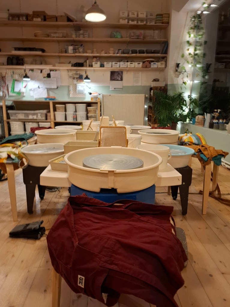 The workshop price includes one piece (a simple cup, small plate, or bowl), with larger pieces such as a handled mug or larger plate/bowl available for an additional 10–15€. Extra pieces can also be purchased on the day. All pieces are handmade by our studio members, giving you a broad and entirely unique selection to work on.