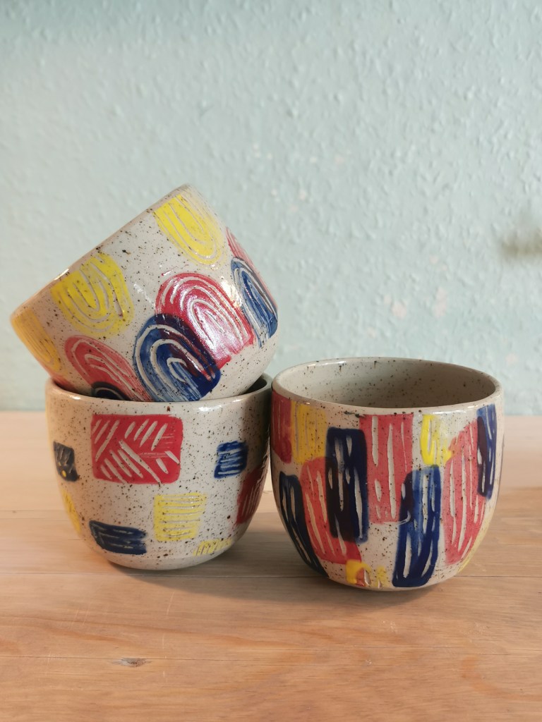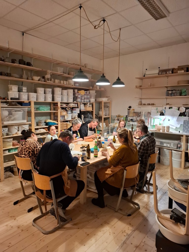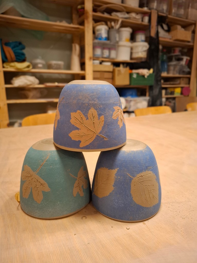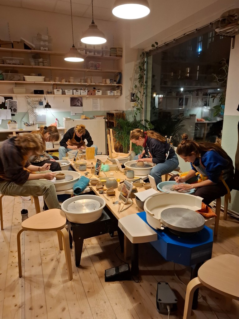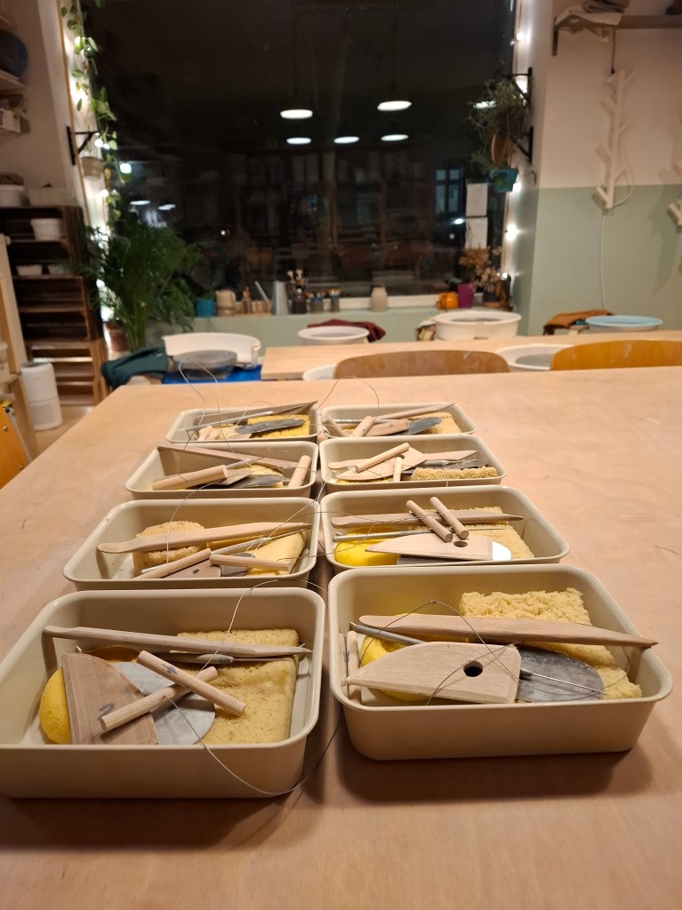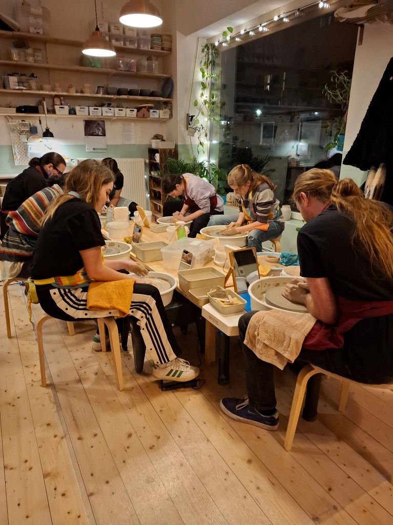 The workshop price includes one piece (a simple cup, small plate, or bowl), with larger pieces such as a handled mug or larger plate/bowl available for an additional 10–15€. Extra pieces can also be purchased on the day. All pieces are handmade by our studio members, giving you a broad and entirely unique selection to work on.